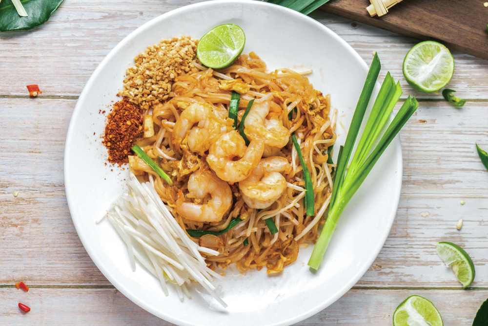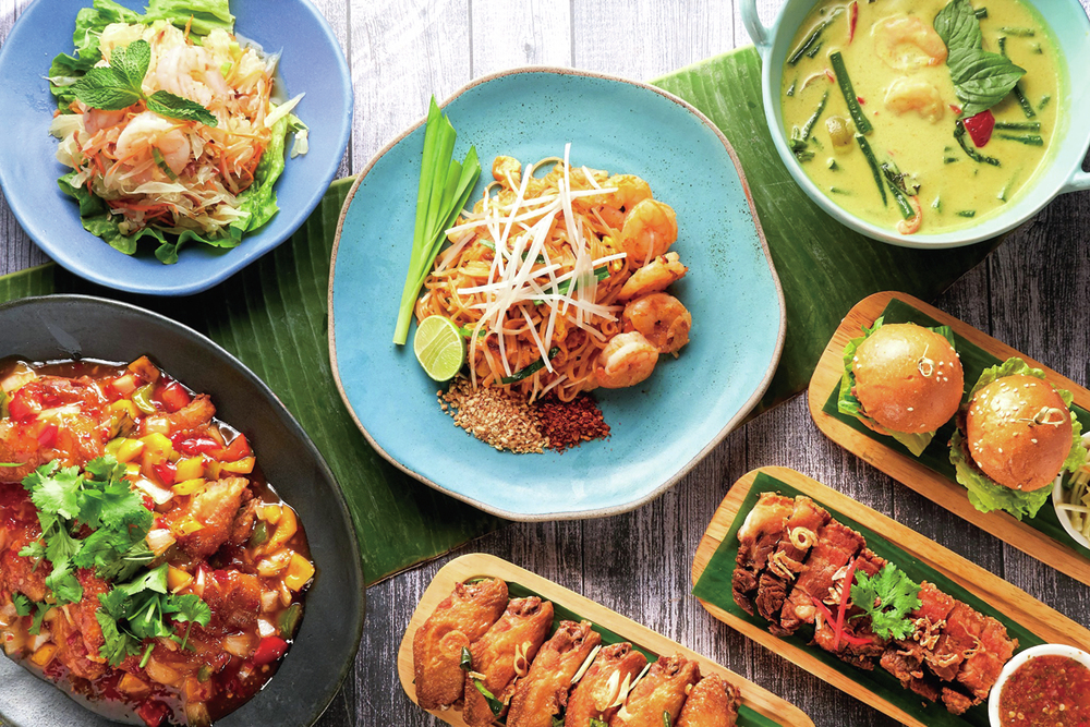 Baan Thai Signatures: Phad Thai Prawns, Papaya Salad, Grilled Chicken Satay, Lamb Shank Massaman Curry, and Mango Sticky Rice