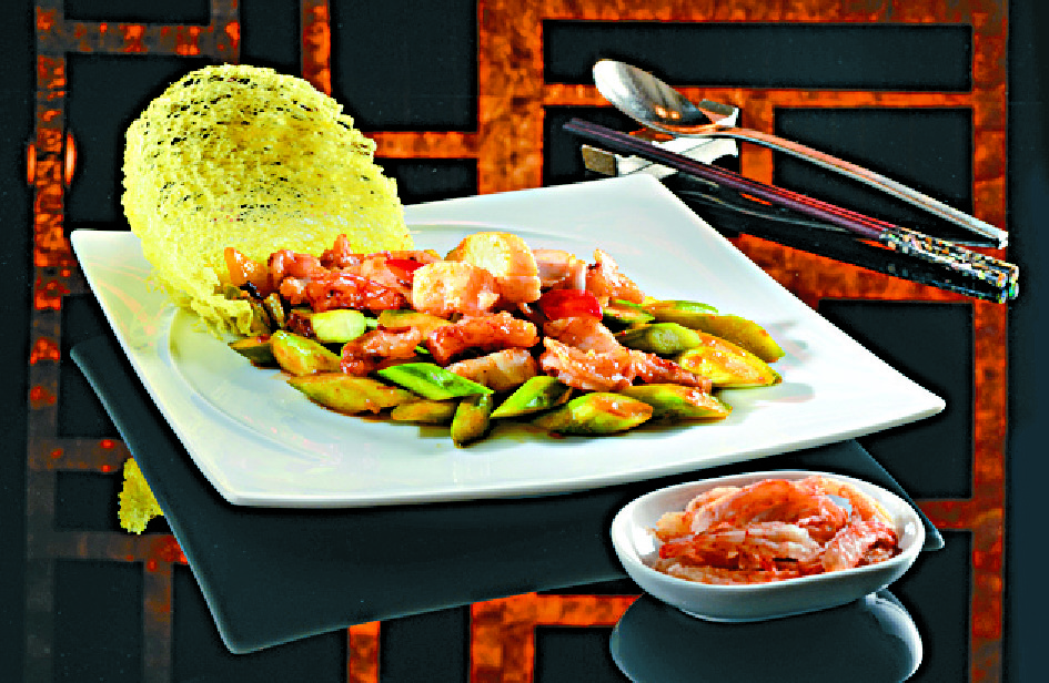 The sliced abalone with scallop, prawn and dried tiger prawn (HK$438) was inspired by fishing nets. Using ingredients from Lamma Island, Li sautes the seafood with asparagus and homemade XO sauce.