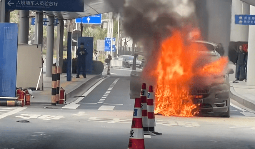 A private car with a Hong Kong license plate caught fire at the Zhuhai port of the Hong Kong-Zhuhai-Macau Bridge (HZMB) on Tuesday afternoon.