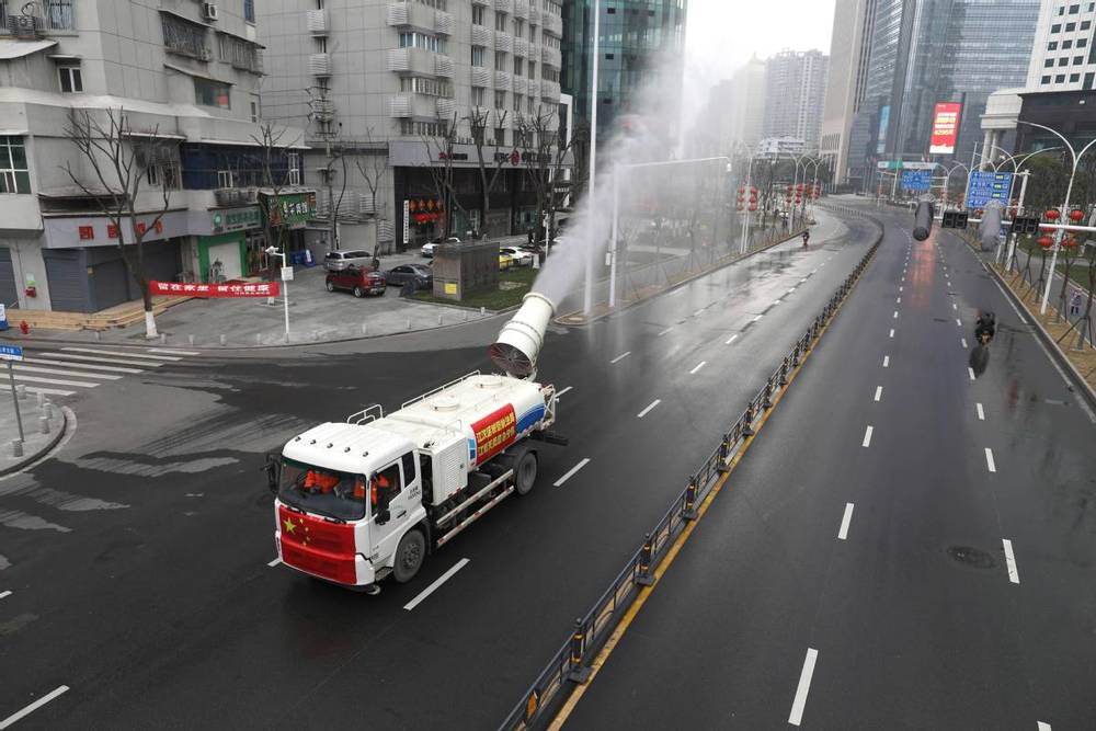 A street in Jianghan district in coronavirus-ravaged Wuhan, in Central China's Hubei province, is disinfected by truck on Monday.