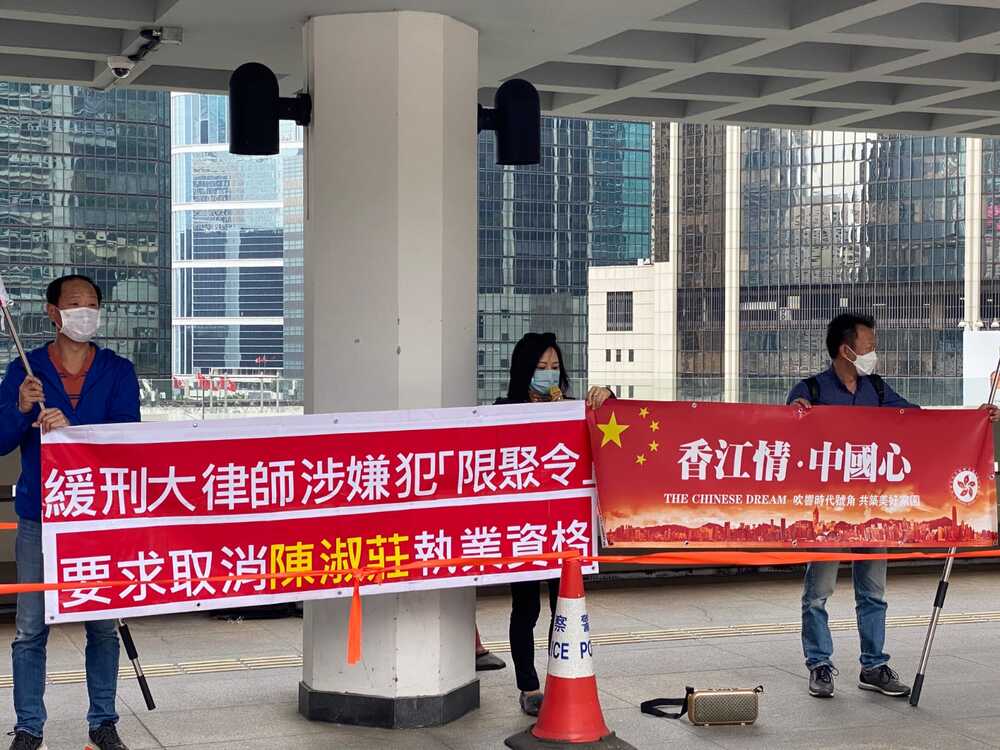 A handful of people joined a protest organized by a pro-government group outside the High Court today, demanding that Civic Party legislator and barrister Tanya Chan be disbarred over claims she breached a new law on public gatherings, RTHK reports.
