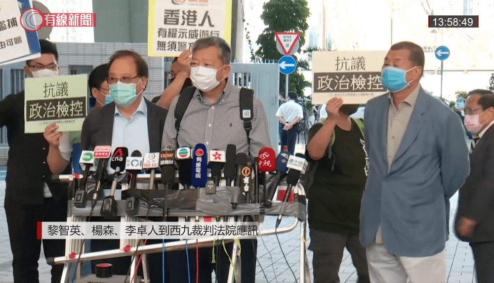 Lai and veteran pro-democracy figures Lee Cheuk-yan and Yeung Sum also appeared at the West Kowloon Magistrates' Courts today for taking part in an unauthorized anti-extradition law amendment protest on August 31 last year.