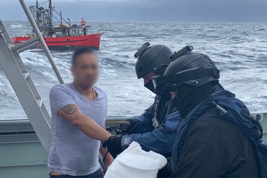 Up to a tonne of drugs was allegedly transferred from the mystery trawler to a smaller boat called "Coralynne" before a dramatic police operation unfolded on Saturday morning.