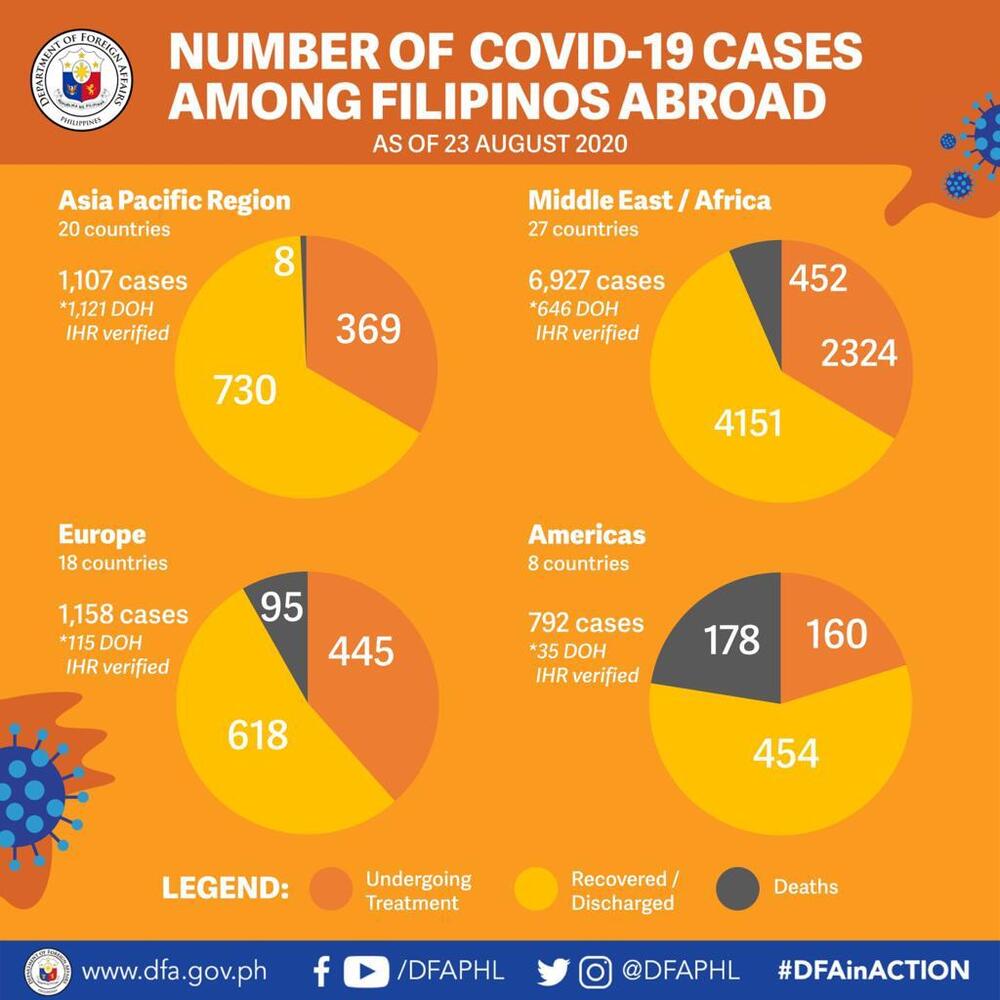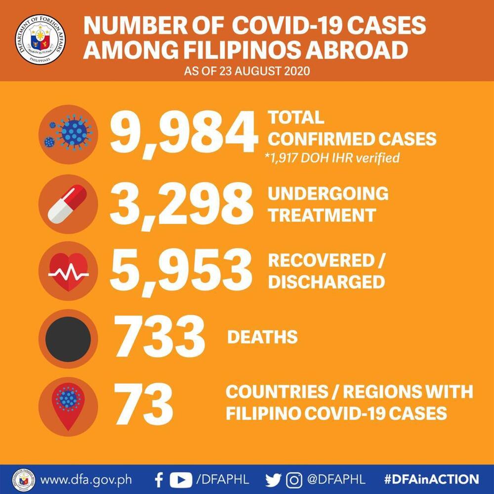 The number of Filipinos abroad who are infected with the new coronavirus climbed to 9,984 on Sunday, with one new additional case, the Department of Foreign Affairs said.