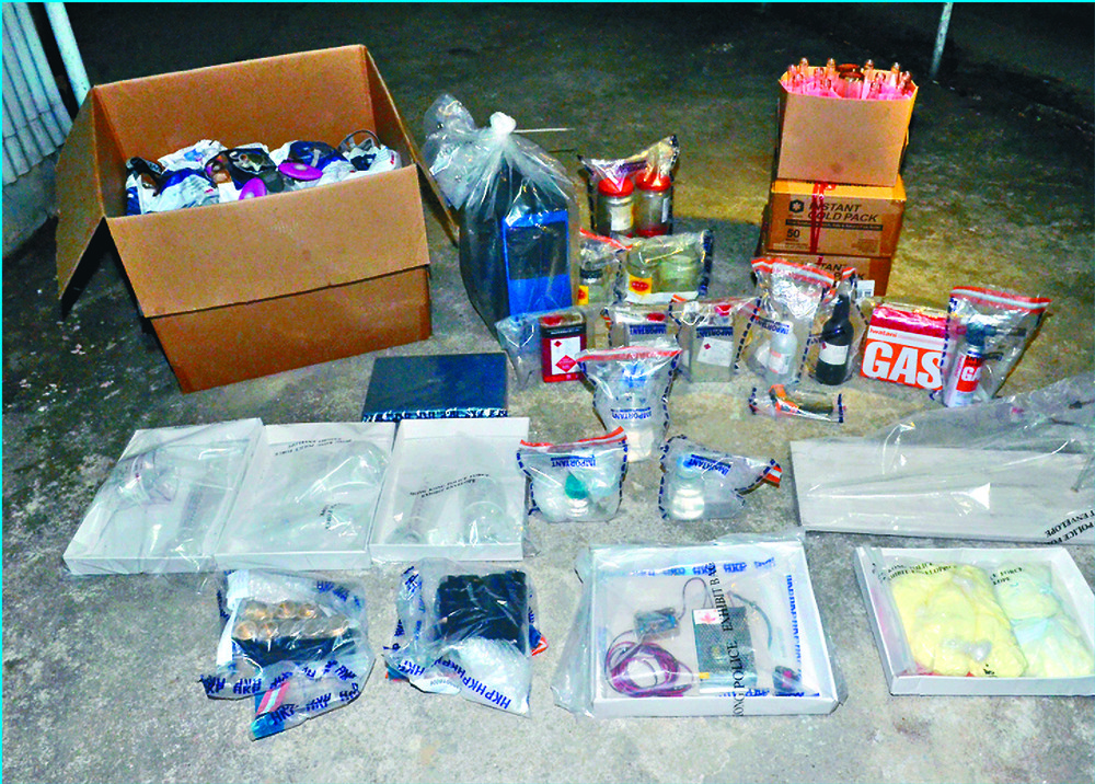 Police also smashed a makeshift explosives laboratory in a house in Ho Par Village, Sheung Shui, seizing beakers, test tubes, lighters, a magnetic mixer, copper tubes, thermometers, gas masks, drainage cleaners, sulfuric acid, petrol and some unknown chemical powder.