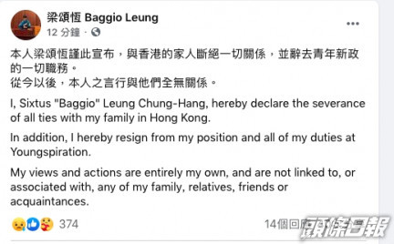 In a social media post, Leung said he would be resigning from Youngspiration and sever all ties with his family in Hong Kong.