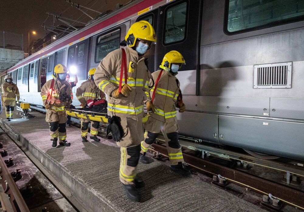 The exercise saw a simulation in which a smouldering phone charger caused dense smoke to spread through a train running from East Tsim Sha Tsui station to the Tuen Ma Line platform of Hung Hom Station.
