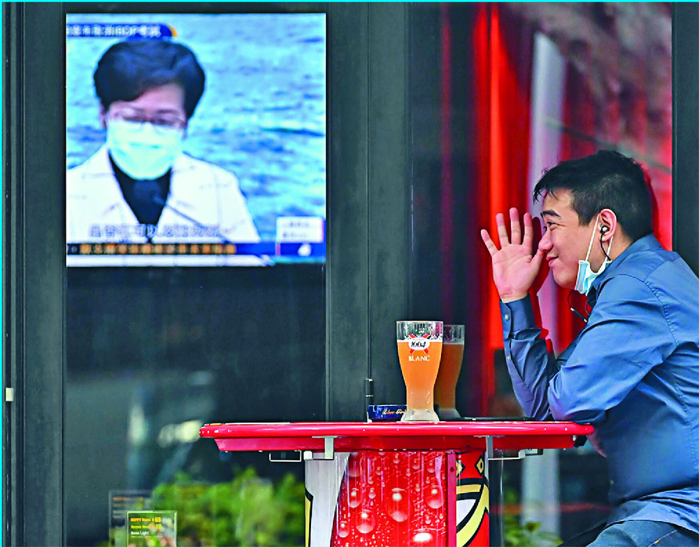 A man enjoys a beer in a bar while listening to Carrie Lam announce the ban. Sing Tao