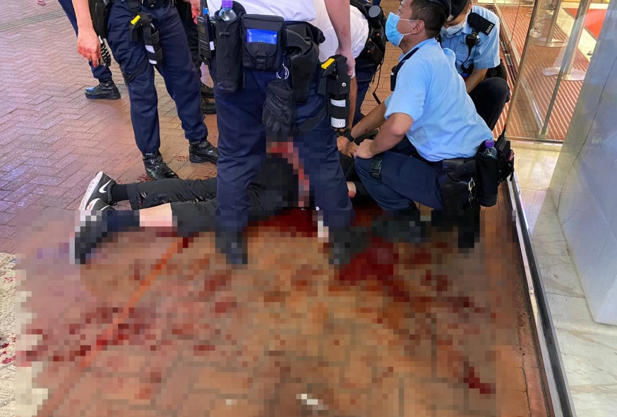 Last night Leung Kin-fai, 50, stabbed the back of a 28-year-old police officer with a knife outside Sogo Department Store in Causeway Bay. The officer suffered severe injury and Leung then killed himself.