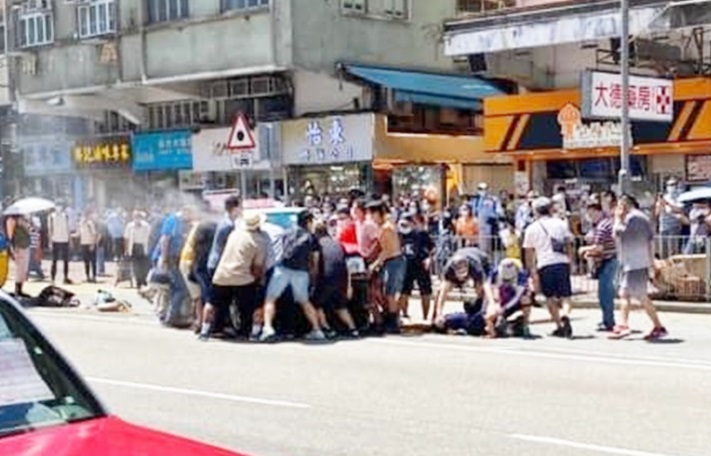 A dozen citizens worked together to lift a taxi in order to save a pregnant woman and others trapped underneath a vehicle involved in an accident that killed one person and injured nine others in Tai Po.