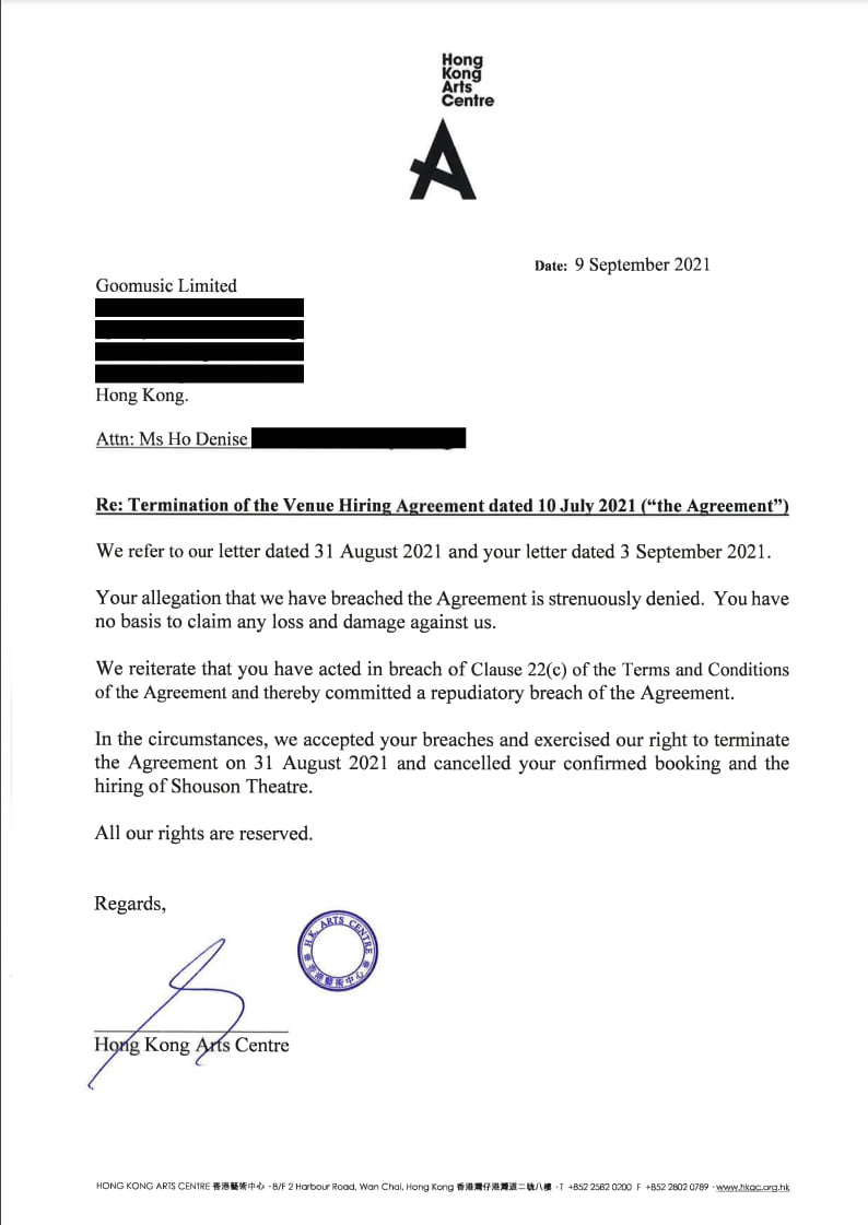 Letter from Hong Kong Arts Centre. Photo on Denise Ho's Facebook.