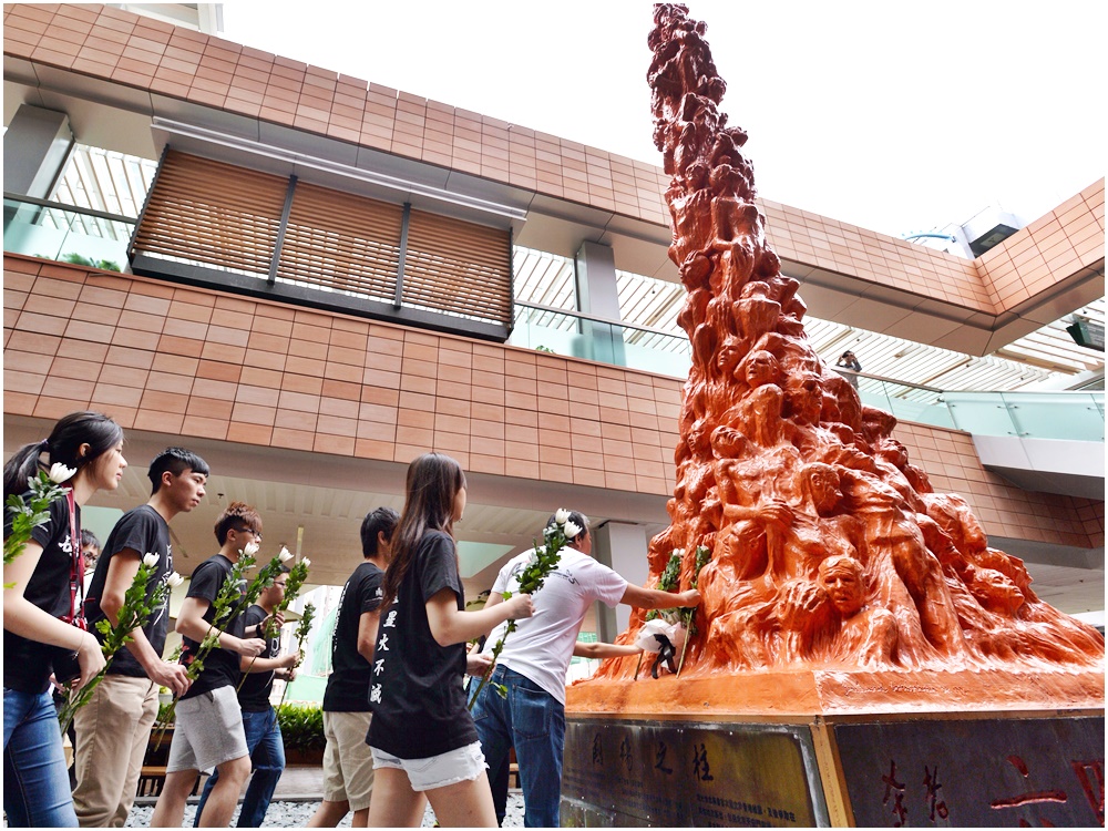 The eight-meter tall statue was built by Danish artist Jens Galschiot. Twisting bodies and painful expressions were carved to symbolize student protesters who lost their lives during the crackdown.