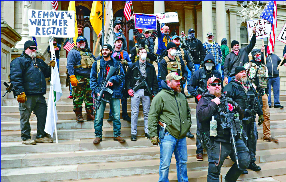 Armed men gather at the statehouse while others protest in their cars against Gretchen Whitmer. AFP, REUTERS