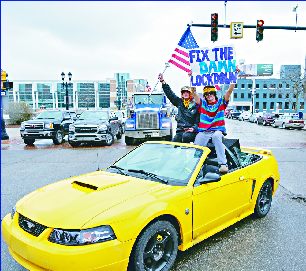 Thousands of protesters in cars with horns honking drove around Michigan's state Capitol to protest stay-at-home orders imposed by governor Gretchen Whitmer.