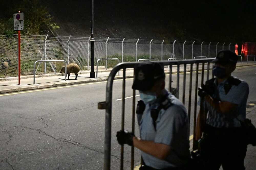 Police and Agriculture, Fisheries and Conservation Department (AFCD) officers were deployed to Shum Wan Road, less than a week after authorities last Friday announced they will capture wild boars in urban areas regularly for killing.