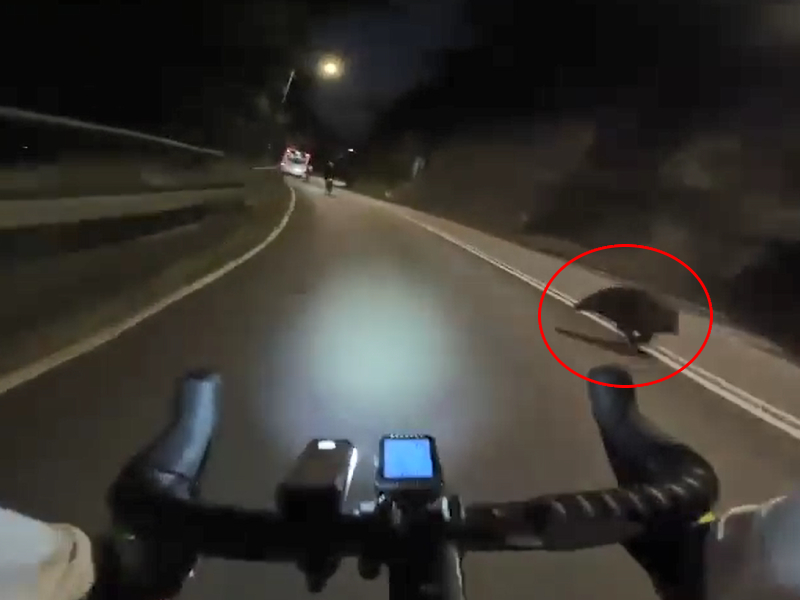 The cyclist can be seen pedaling quickly downhill and into a left turn as the wild boar suddenly rushes across the road from right to left.