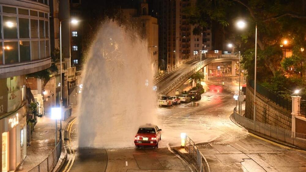 Water was seen springing up to over 10 meters in the air after an underground pipe on Pok Fu Lam Road broke and burst open a ditch cover in the early hours on Saturday.
