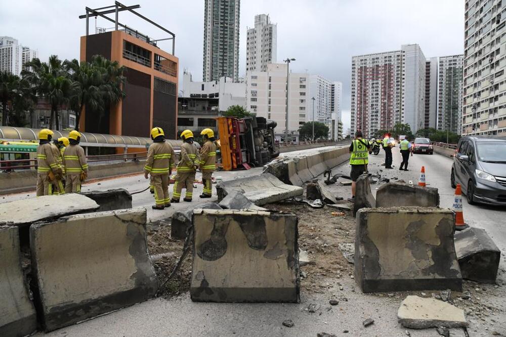 The crane truck traveling along Lung Cheung Road towards Kwun Tong crashed and overturned near a flyover at Choi Hung Estate.