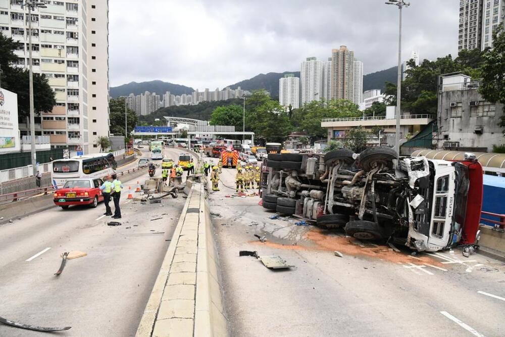 A crane truck crashed and overturned at around 5am on Tuesday, causing the closure of all eastbound lanes as well as the westbound fast lane of Lung Cheung Road for over 4 hours.