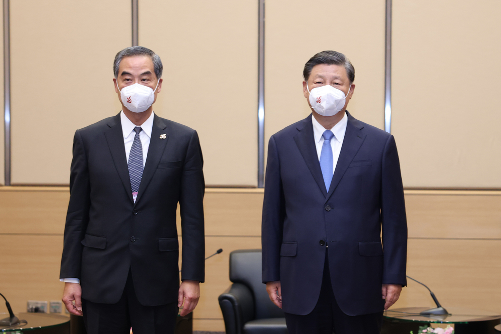 Former CE Leung Chun-ying (left) takes a photo alongside President Xi Jinping (right) on July 1, 2022. (Xinhua)