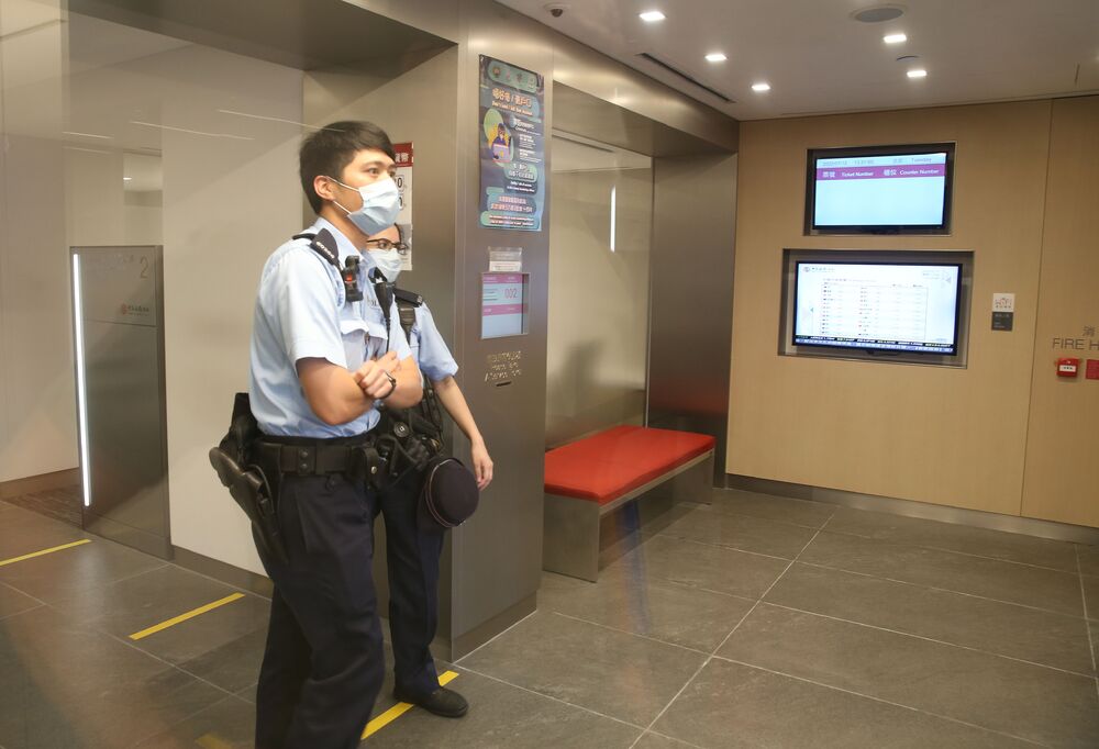 Police officers are spotted standing guard in the bank after the robbery.