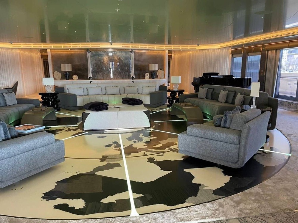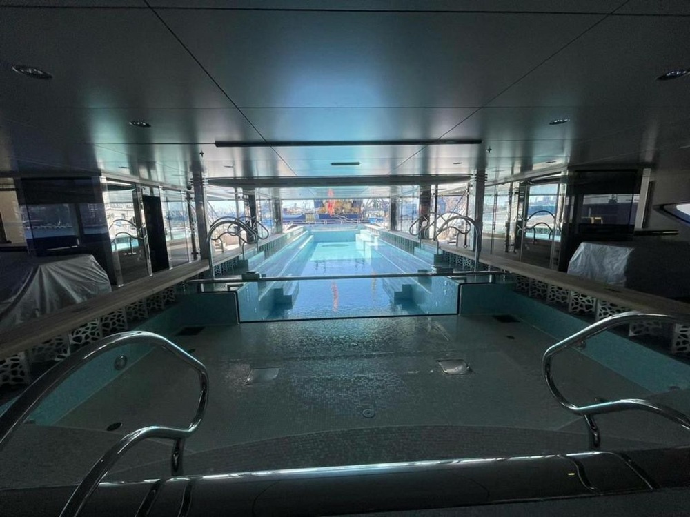 The multi-million-dollar yacht features a gym, elevator, swimming pool, movie theatre, tender garage, swimming platform, air conditioning, BBQ, beach club, spa room, sauna, underwater lights, and beauty salon.