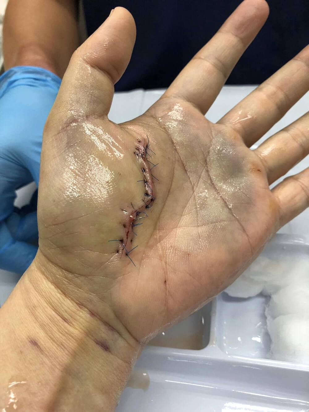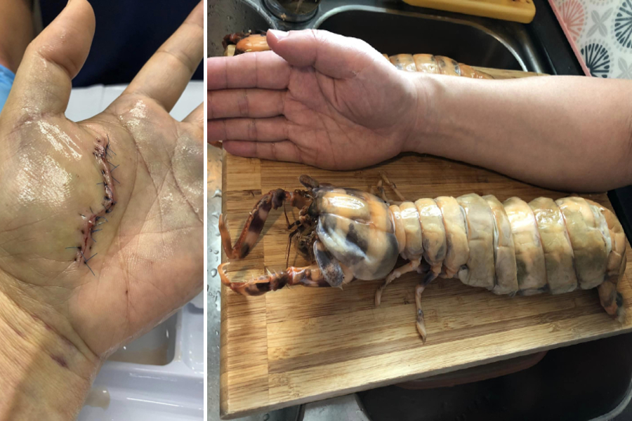 The netizen surnamed Yip shared on Facebook Sunday a picture of a long scar and the stitches on his left palm after being attacked by the mantis shrimp.