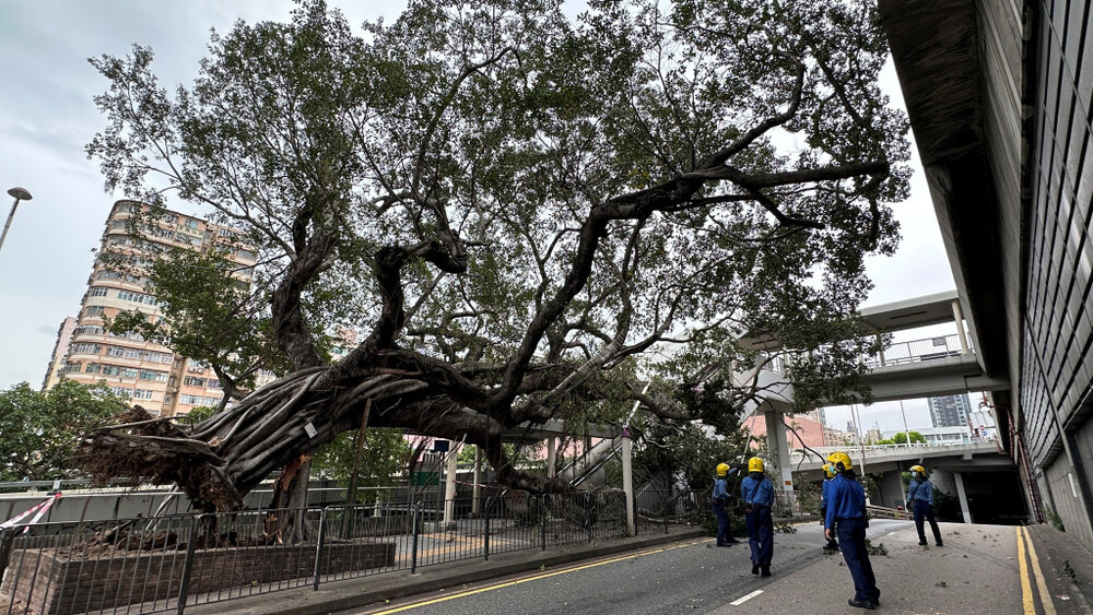 A 10-meter-high banyan tree crushed a lamp post in Mong Kok during the typhoon this morning, causing the street to be blocked to vehicles.