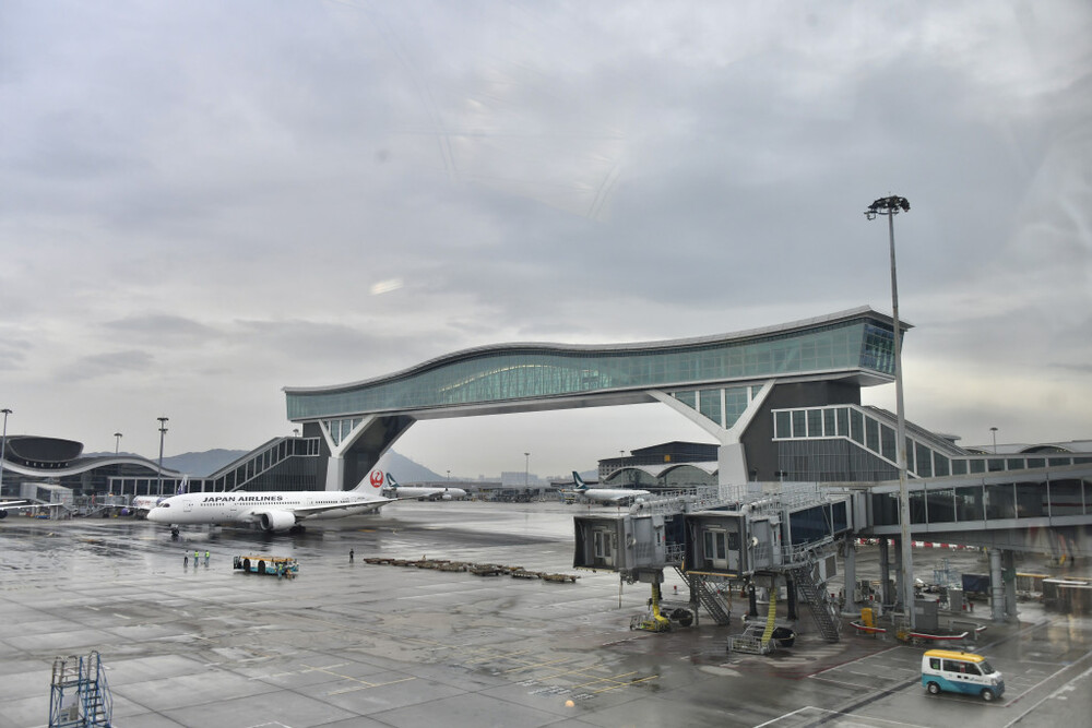 An observation deck and restaurants were set up at both ends of the bridge. The floor is partly made of glass, allowing people to see planes passing through underneath the bridge.