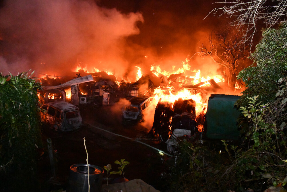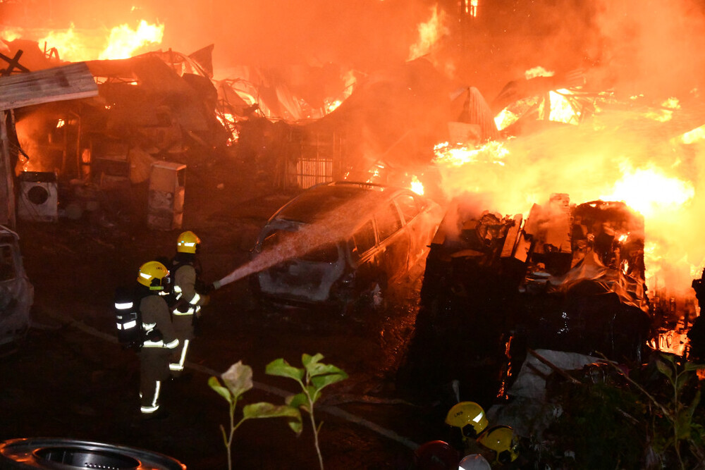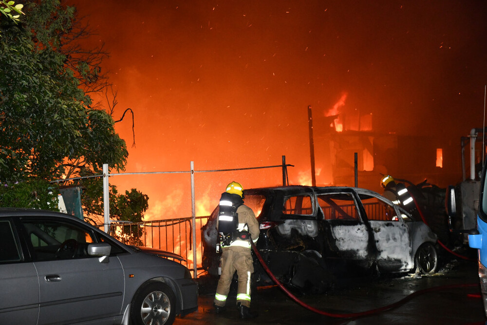 About 80 residents there were evacuated and photos showed that the blaze burned down three tin sheet houses located next to each other, as well as two private cars and a light goods van nearby.