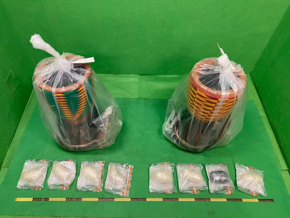 Officers inspected an air cargo consignment, declared as carrying handicrafts, arriving in Hong Kong from Africa and found the batch of suspected methamphetamine concealed inside two djembes.