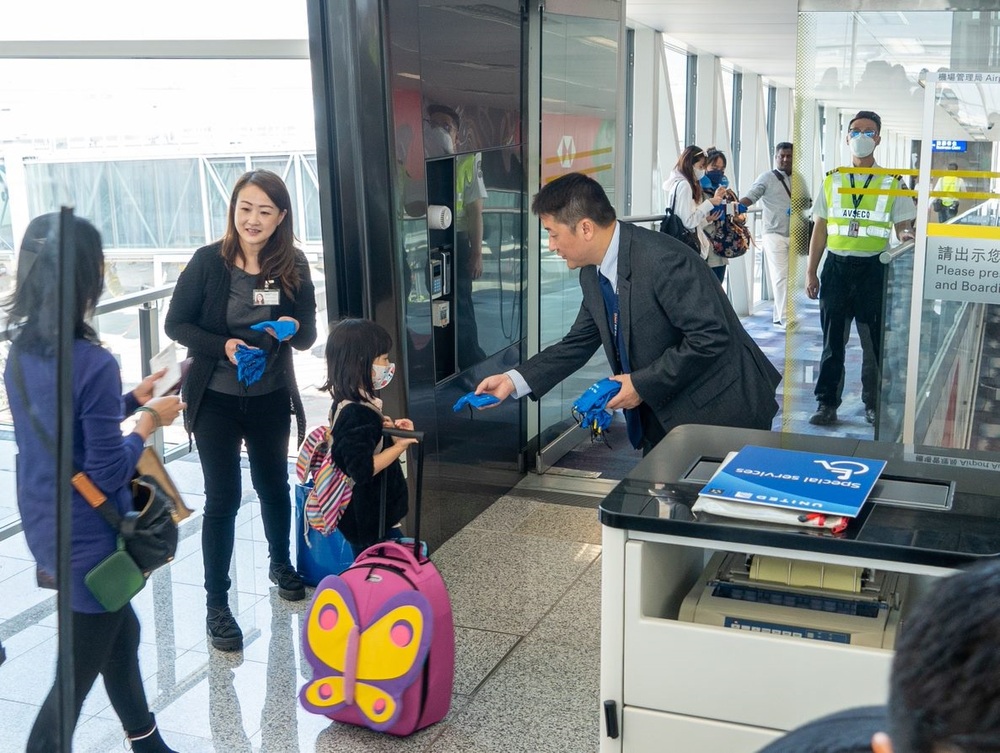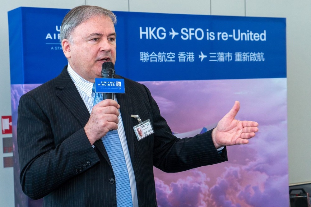 On March 6 at the departure gate of United flight UA862 at the Hong Kong International Airport, Walter Dias, regional director of Sales for Greater China and Southeast Asia, and Consul General Gregory May of the U.S. Consulate celebrated the return of the San Francisco nonstop service to Hong Kong by making remarks before passengers boarded the flight.