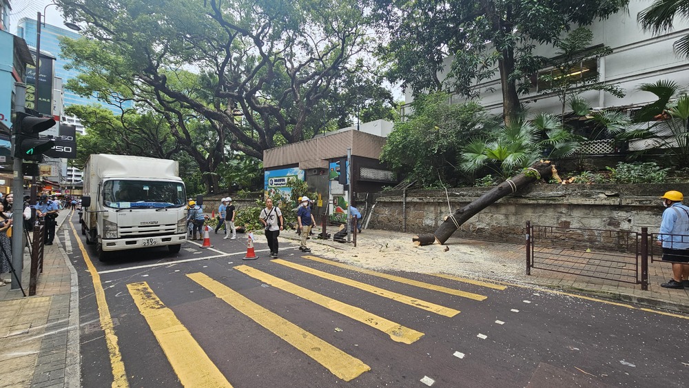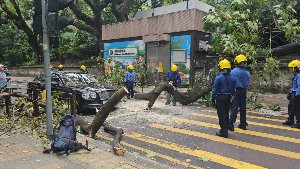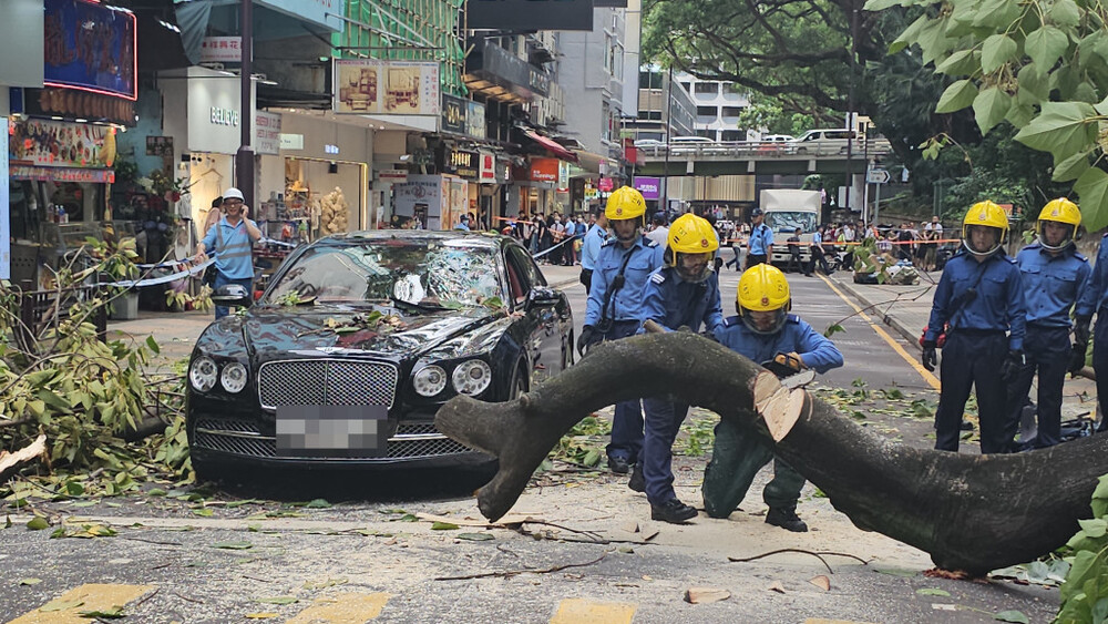 The incident occurred around 2.30 pm when the Bentley was traveling on Haiphong Road in Tsim Sha Tsui. After the tree collapsed, it lied still and occupied the two driving lanes of the road.