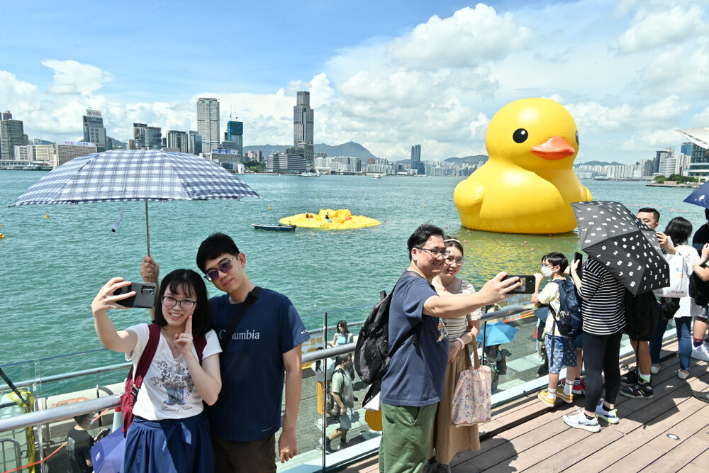 The inflation process for the pair of ducks was completed on Thursday night in the waters opposite the Convention Plaza in Wan Chai. At 11 am yesterday (Fri), the ducks started to sail towards the Central promenade at the commencement ceremony.
