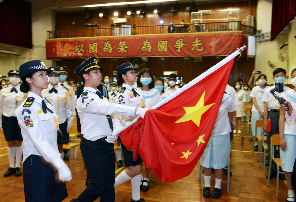 Photos posted by Yeung on social media showed students at the scene in uniforms and masks while holding small versions of the national flag as well as of the SAR's flag.