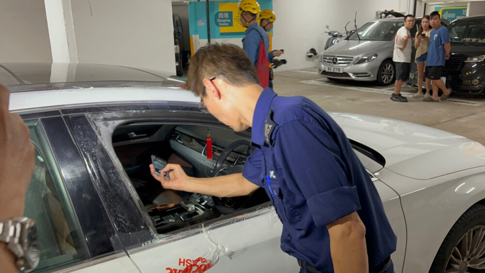 A poodle was found locked in a private car for three hours in Ma On Shan and was later rescued by firefighters on Friday night as they broke one of the windows to retrieve the dog.