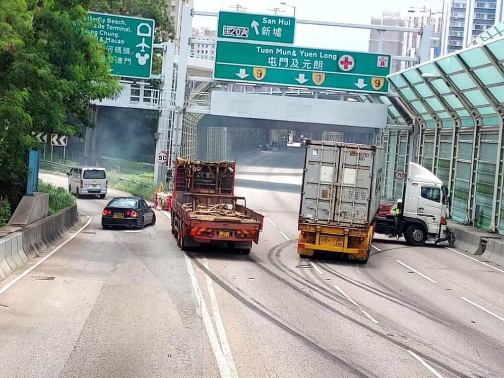 All three driving lanes on Tuen Mun Road were once blocked on Friday afternoon following an incident that involved a truck and a container truck.