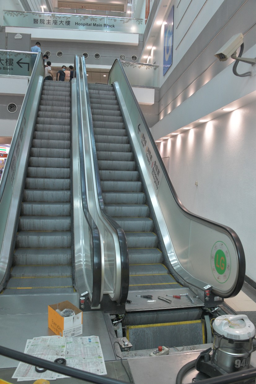 The escalator is located in the Main Block of the hospital, connecting the ground floor and the lower ground floor.