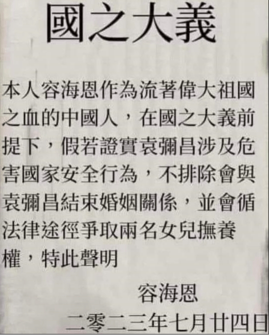 “If Derek Yuen Mi-chang is proved to be involved in activities endangering national security, I do not rule out the possibility of ending our marriage and fighting for the custody of our two daughters through legal means,” read the newspaper statement circulated online.