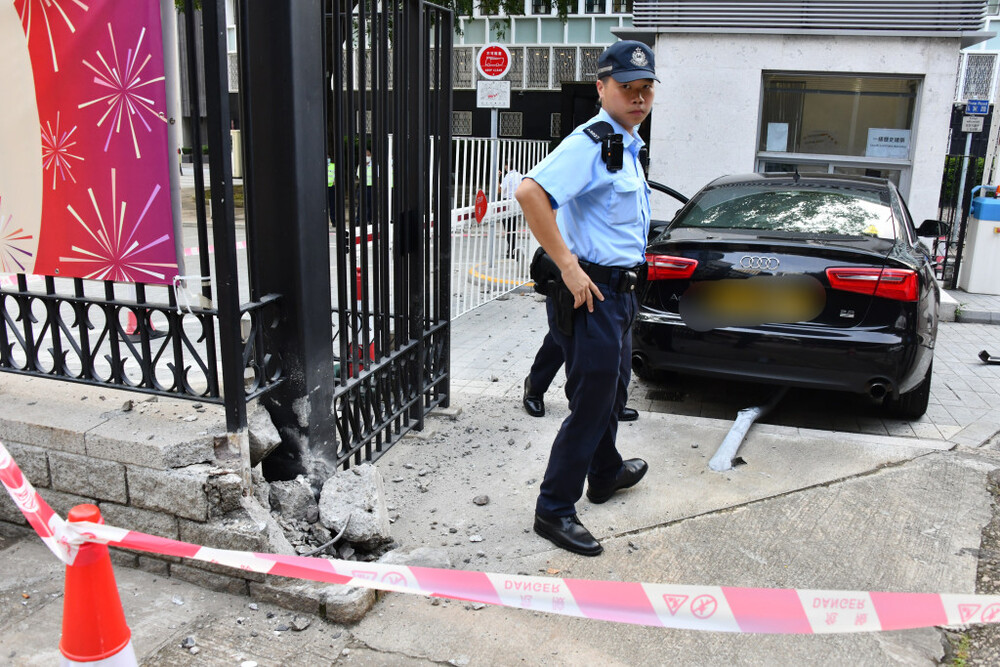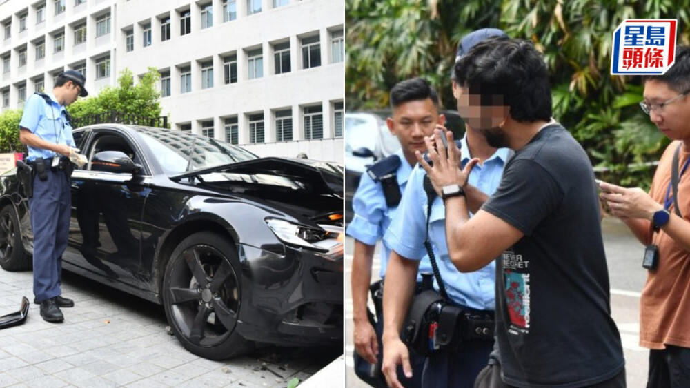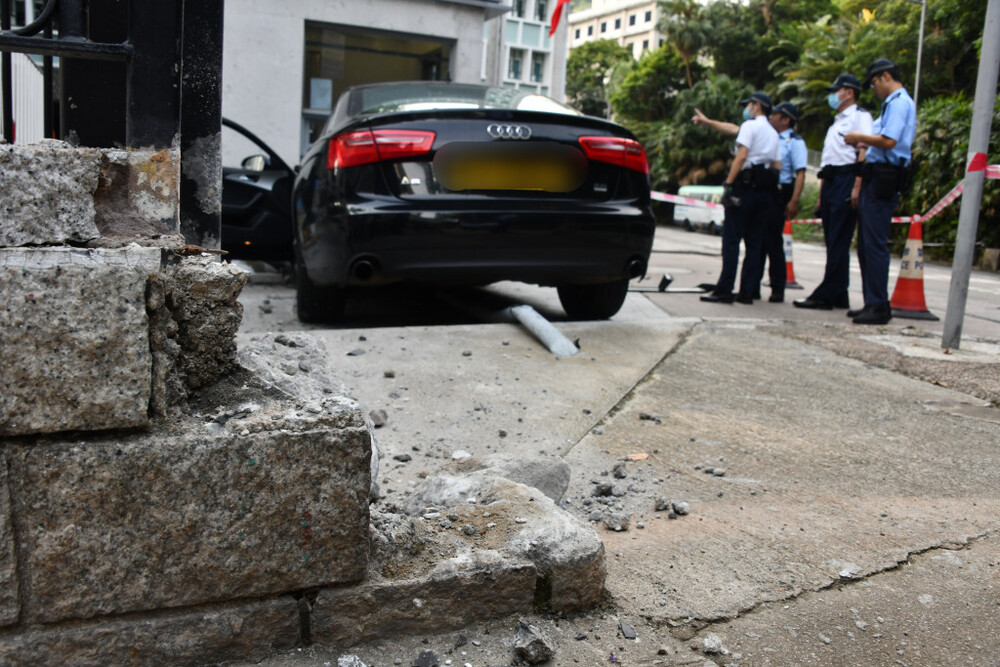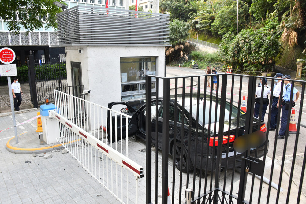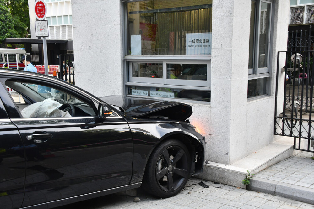 Around 7 am today, a black sedan rammed into a security booth at the Justice Center entrance on 18 Lower Albert Road in Central.