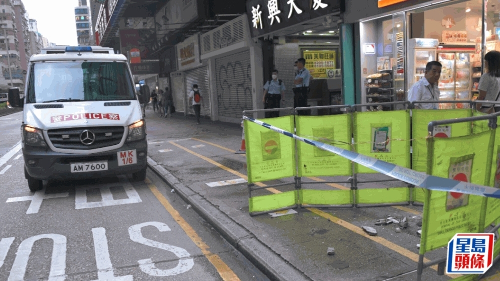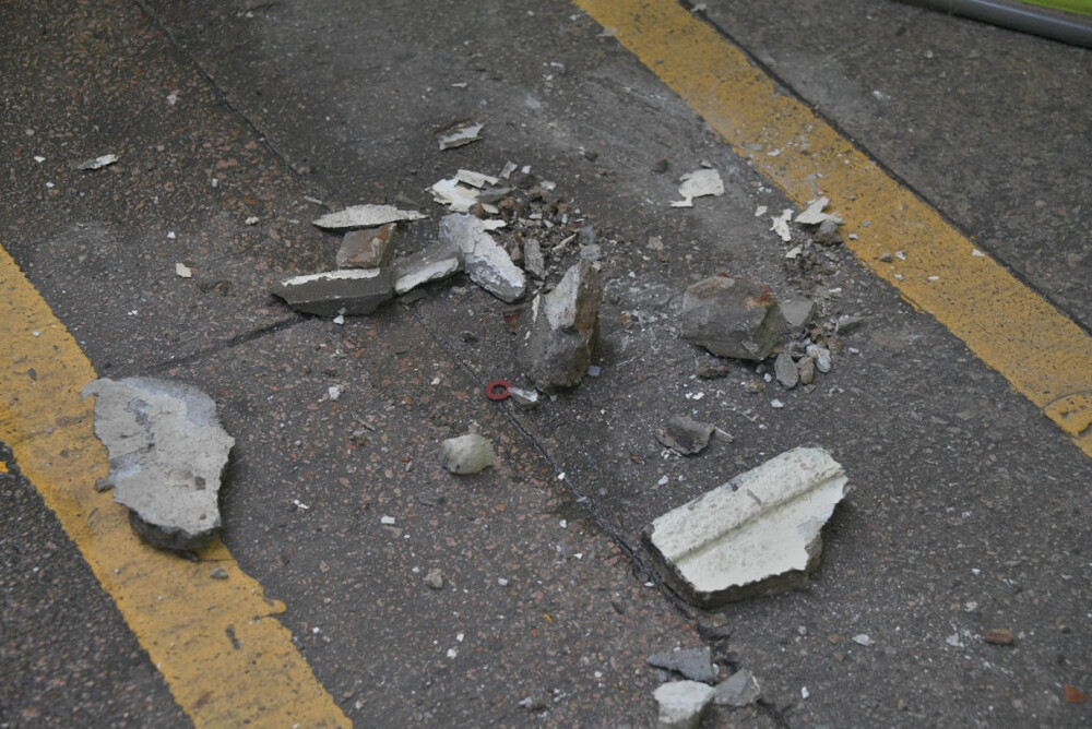 The second case occurred around 8 am at Sun Hing Building on Nathan Road. The concrete pieces fell from about three meters high and landed on a bus stop outside a convenience store.