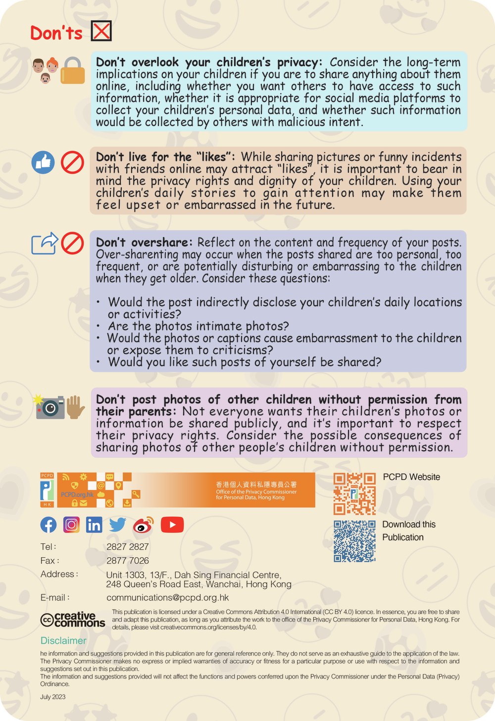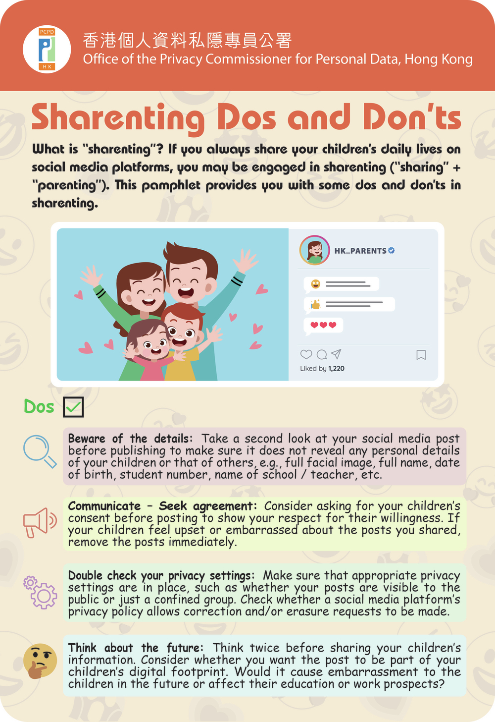 The Office of the Privacy Commissioner for Personal Data on Thursday published a pamphlet entitled “Sharenting Dos and Don’ts”, which provided some tips for parents before they publish any post about their children online.
