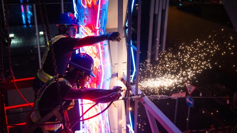 Construction workers remove a neon sign of Tai Ping Koon Restaurant in Hong Kong, which was erected in 1964. (Bertha WANG / AFP)