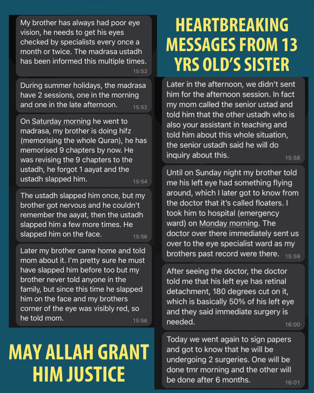 The boy was allegedly struck by a teacher at the center after failing to recite a verse of the Koran. A hospital check-up later confirmed that the boy had a detached retina with a 180-degree tear - which would require surgery.