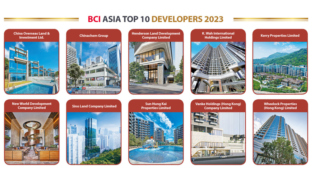 This year, the BCI ASIA TOP 10 DEVELOPERS 2023 awards are bestowed on China Overseas Land & Investment Ltd.; Chinachem Group; Henderson Land Development Company Limited; K. Wah International Holdings Limited; Kerry Properties Limited; New World Development Company Limited; Sino Land Company Limited; Sun Hung Kai Properties Limited; Vanke Holdings (Hong Kong) Company Limited; and Wheelock Properties (Hong Kong) Limited.
