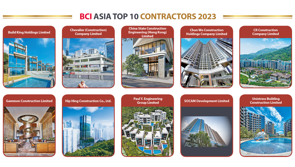 Winners of the BCI ASIA TOP 10 CONTRACTORS 2023 award include Build King Holdings Limited; Chevalier (Construction) Company Limited; China State Construction Engineering (Hong Kong) Limited; Chun Wo Construction Holdings Company Limited; CR Construction Company Limited; Gammon Construction Limited; Hip Hing Construction Co., Ltd.; Paul Y. Engineering Group Limited; SOCAM Development Limited; and Unistress Building Construction Limited.