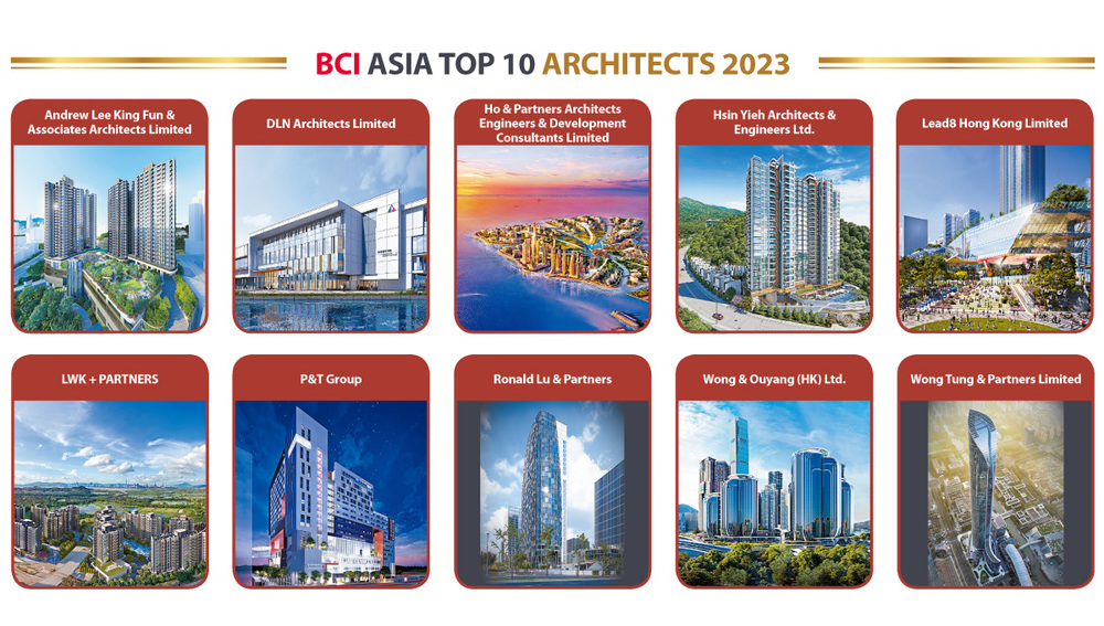 Meanwhile, the BCI ASIA TOP 10 ARCHITECTS 2023 awards are conferred on Andrew Lee King Fun & Associates Architects Limited; DLN Architects Limited; Ho & Partners Architects Engineers & Development Consultants Limited; Hsin Yieh Architects & Engineers Limited; Lead8; LWK + PARTNERS; P&T Group; Ronald Lu & Partners; Wong & Ouyang (HK) Ltd.; and Wong Tung & Partners Limited.