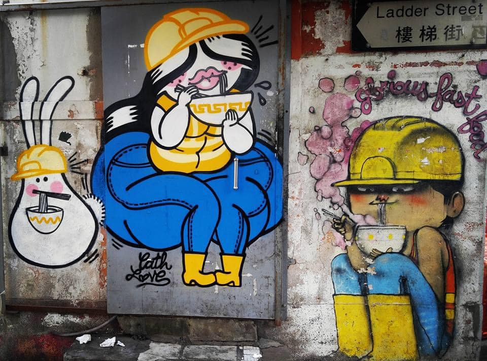 Both graffiti works originally painted on the front of the fast-food shop can see three construction workers (one in the form of a bunny) wearing yellow helmets, each holding a bowl of noodles.