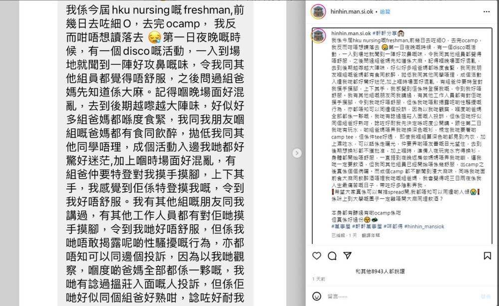 The anonymous Instagram post alleging that a first-year female student was indecently assaulted at a three-day camp in Yuen Long’s Tai Tong Holiday Camp.