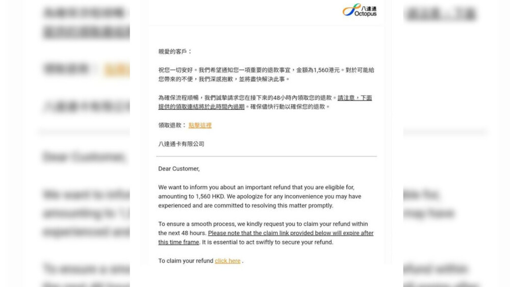 The phishing email, claiming to be sent on behalf of Octopus Limited, asked receivers to click on the so-called “claim link” to get the refund from the company and added that the link would expire in 48 hours.